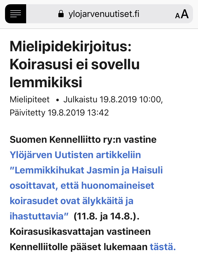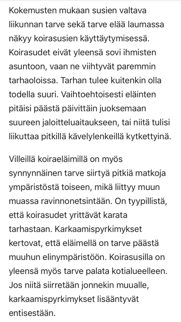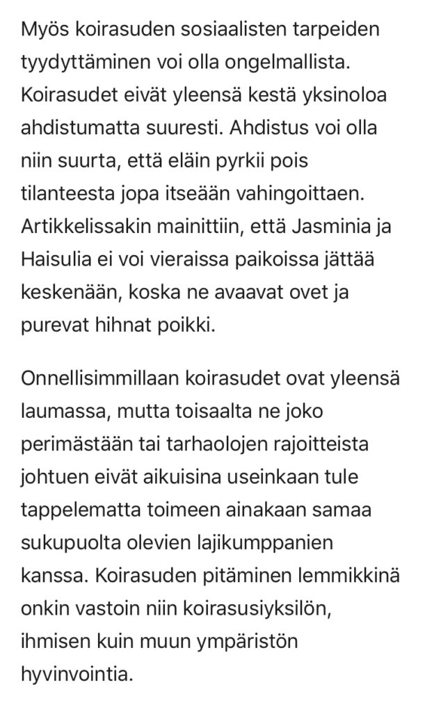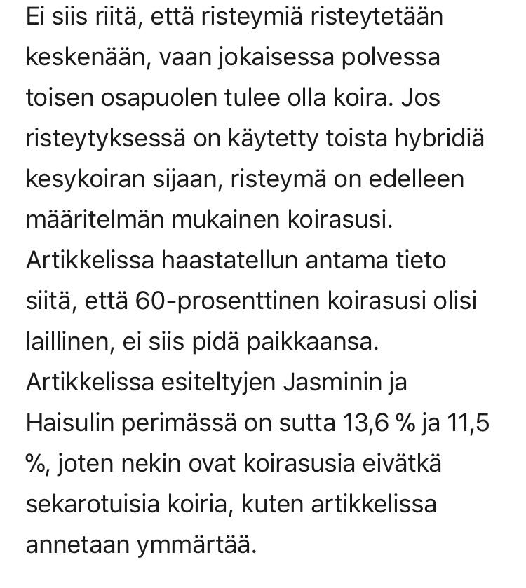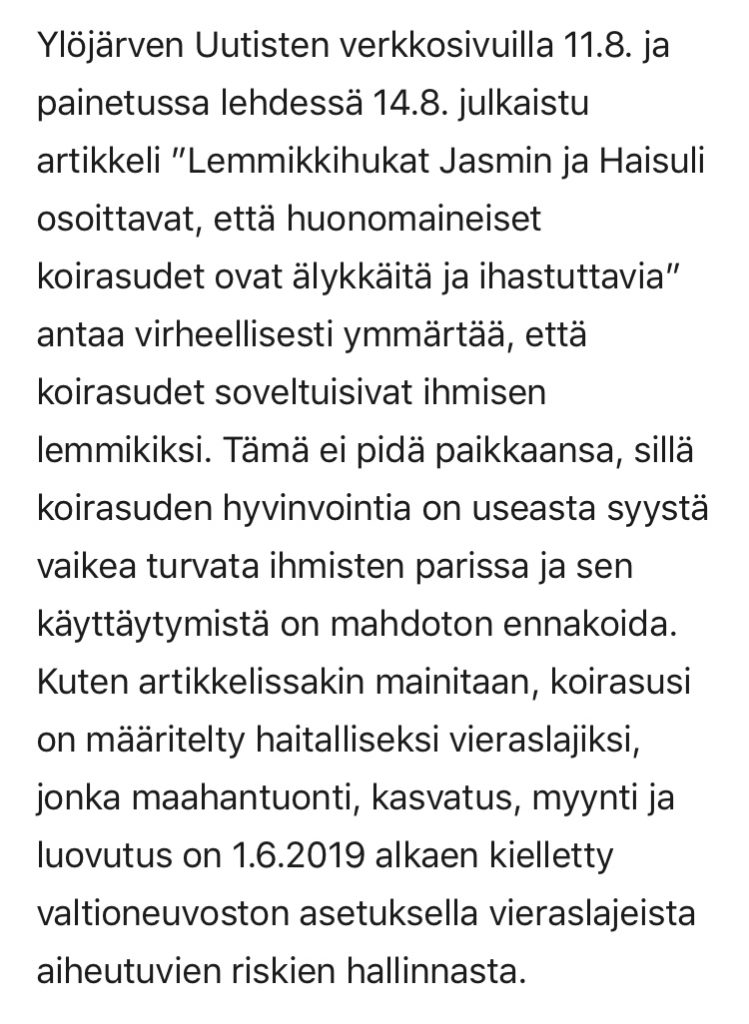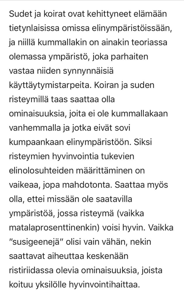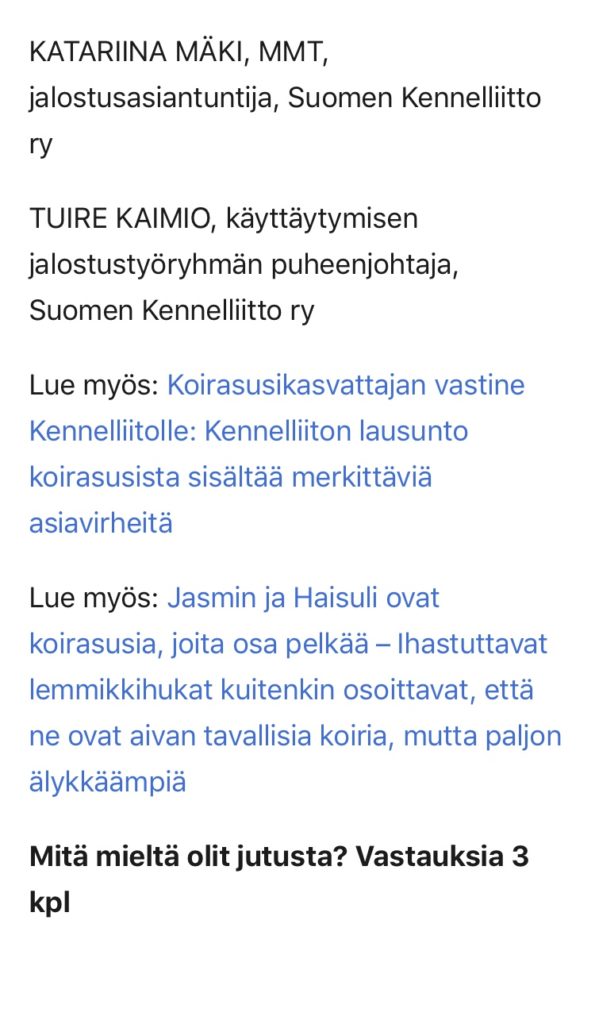 Susikoirakasvattaja – tai ehkä koirasusikasvattaja viimeaikaistenkin pentuilmoitusten johdosta – Jenni Korhonen kirjoitti Kennelliitolle pitkän ja jopa hyvin asiallisen vastauksen. Kirje löytyy kennelin Facebook-sivulta julkisena joten en vaivaudu pitkää tekstiä tänne lainaamaan.
