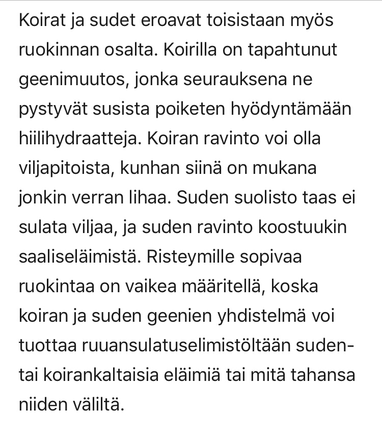 En nyt oikein pääse yli tästä, että jalostusasiantuntija ei ilmeisesti ymmärrä edes genetiikan perusteita, monimutkaisemmista asioista puhumattakaan. Ja ettäkö koira olisi mutatoitunut viljansyöjäksi? Tähän on vaikea keksiä edes sanottavaa, kun tekstiä lukee vain monttu auki.