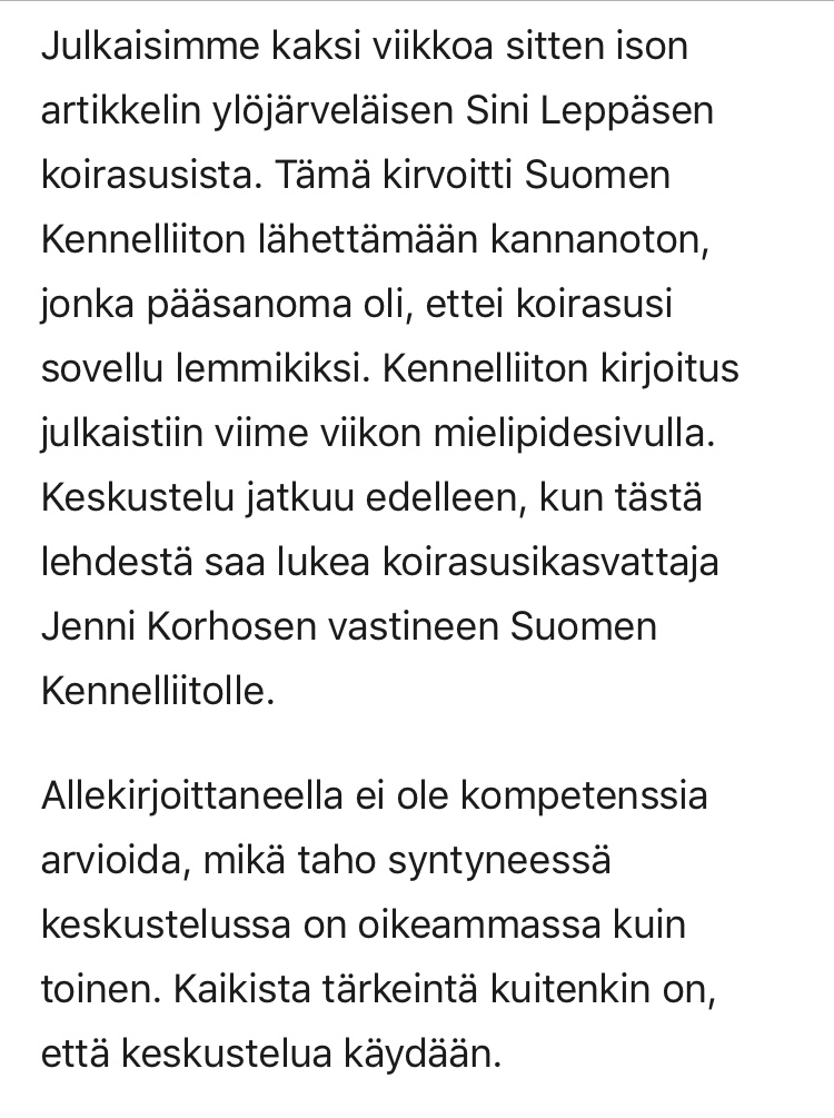 Ei tiedä kumpaa uskoa, Kennelliittoa vai alan harrastajia, taitaa tuumia jo lehden päätoimittajakin. Aiheeseen liittyvä pääkirjoitus vielä Kennelliiton tekstin jälkeen.