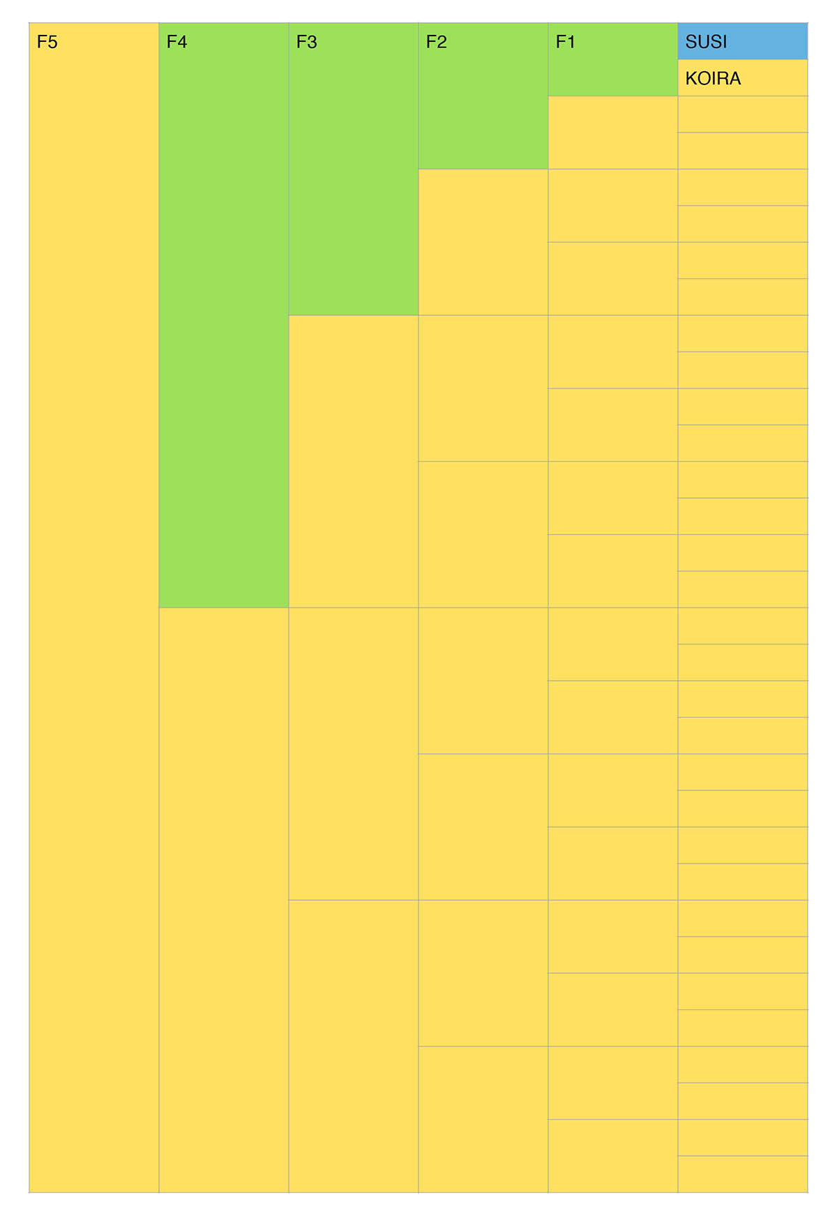 Tai mitä sanotte tuosta että F5 polven eläimessä, kun sukutaulussa on vain yksi susi, on susiprosentti 3,125. Että tällainen yksinkertainen matematiikka (100/32 eli 100% jaettuna 5. polven esivanhempien lukumäärällä – havainnollistava kuva) toimisi genetiikan kanssa? Onko Katariina Mäki aivan hullu? Kuka enää ottaa häntä vakavasti?