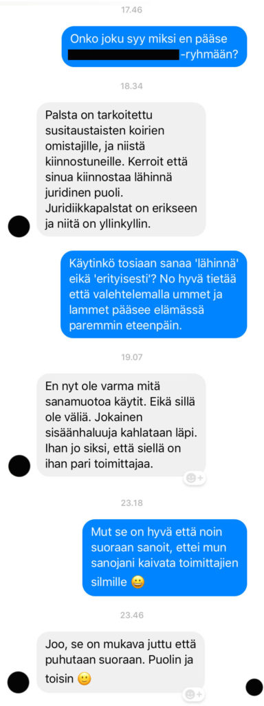 Susikoiraryhmät ovat lokeroissa, kuten harrastajatkin. Vai pitäisikö puhua laumoista johtajineen. Me, nuo muut, ja ne toiset. Facebookin suljetuissa ryhmissä on helppoa muokata todellisuutta omanlaisekseen, voi yksinkertaisesti vain hiljentää ne, joiden sanoma ei miellytä. Laittaa oven kiinni ja lukkoon ja olla kuulematta muuta totuutta kuin omansa. Tietää paremmin, mitä oman lauman, ja seuraajiensa, voi antaa kuulla. Olisihan se vähän noloa, jos luurangotkin kolkuttelisi kaapinovia, kun joku pääsee jo liian lähelle omaa henkilökohtaista totuutta.
